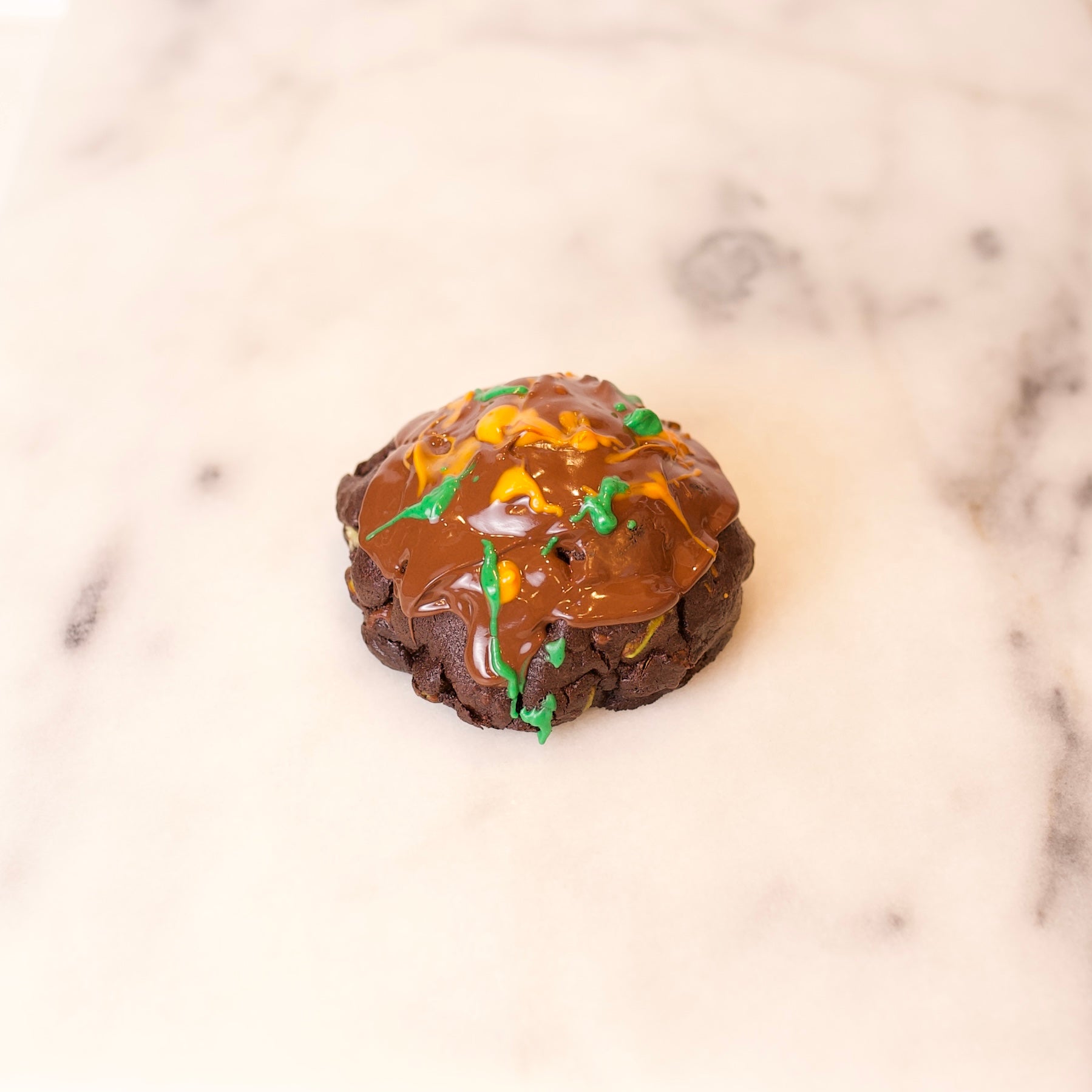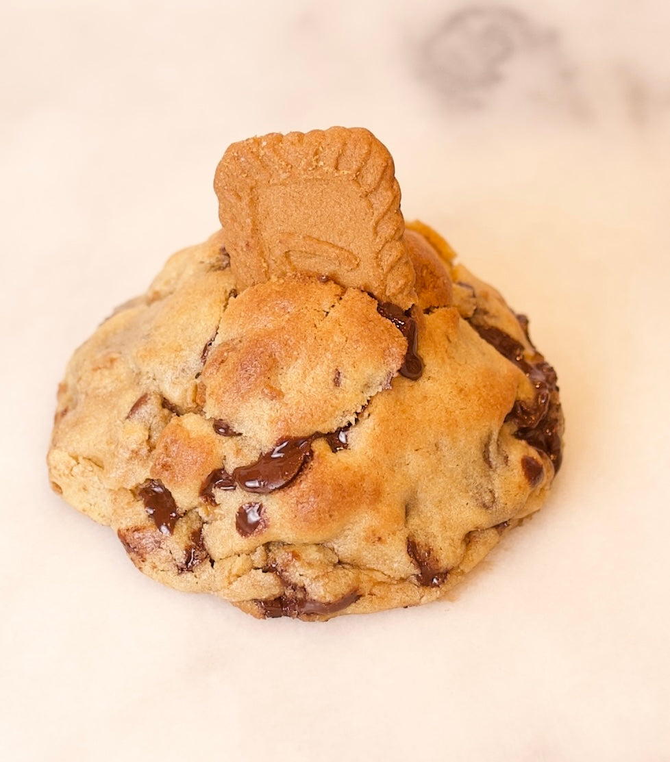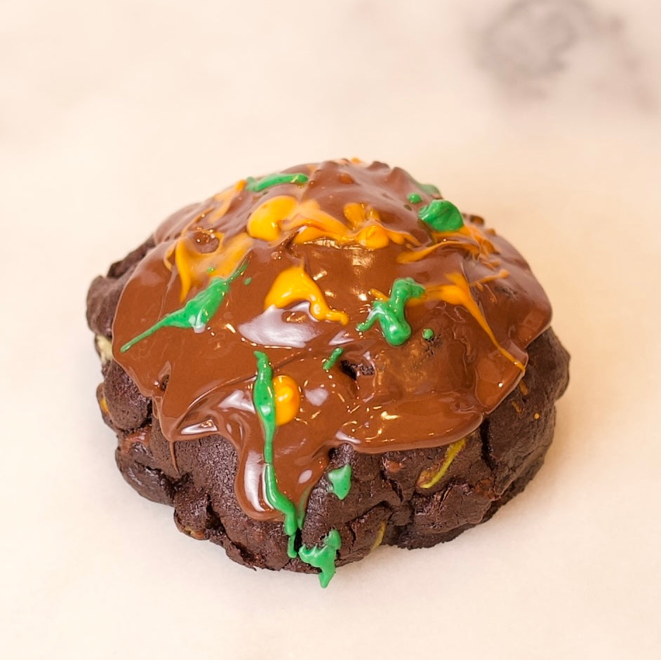 Chocolate cookie with milk chocolate chips, filled with filo dough noodles, pistacho cream and tahini.